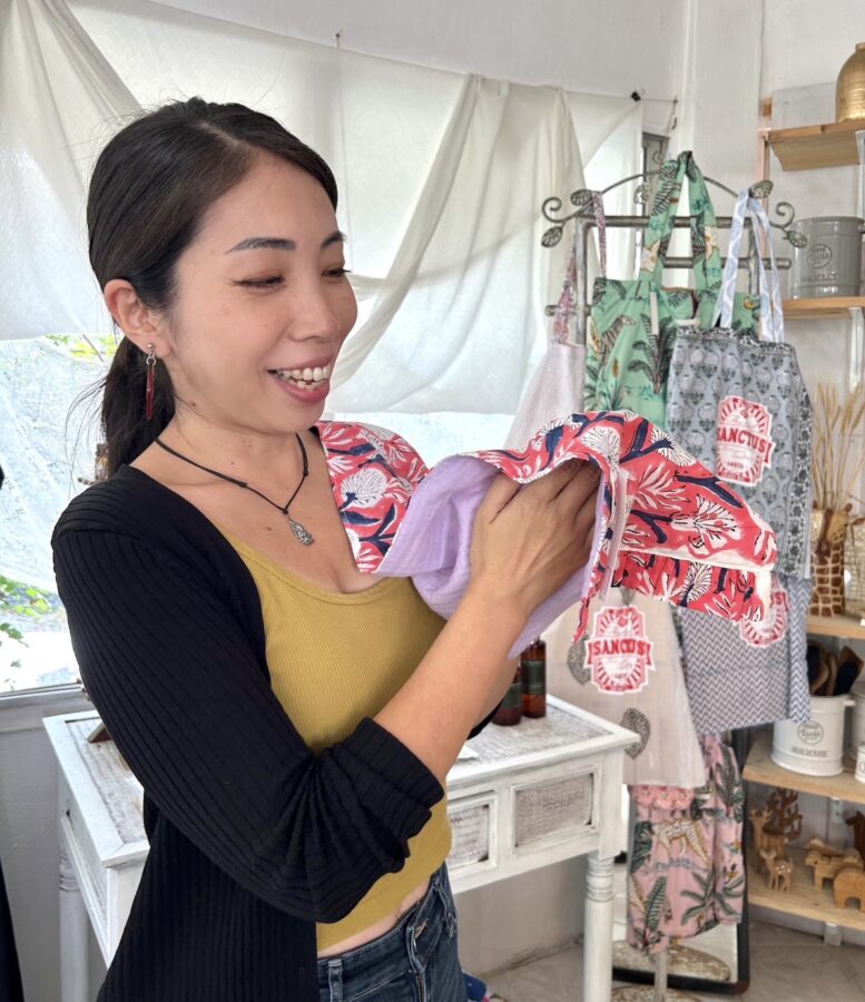 「肩にかけるタイプの手拭いですよ。洗い物や作業をする忙しいお母さん達のためにつくったんです」